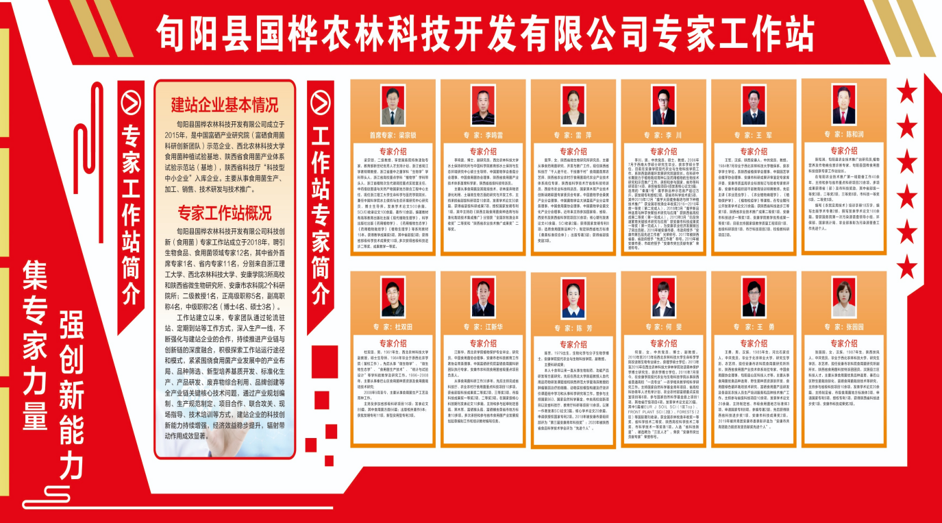 公司聘请浙江理工大学生命科学与医学学院院长,教育部新世纪优秀人才支持计划、浙江省钱江学者特聘教授,浙江省“生物学”学科带头人,浙江省高校重点学科“植物学”学科带头人,浙江省植物次生代谢调控重点实验室主任,中药指纹图谱与天然产物国家地方联合工程中心主任梁宗锁教授为首席科学家,西北金年会体育李铭雷、杜双田、安康学院王军、李川等教授,安康农科院食用菌研究所等生物食品、食用菌生产加工领域12名专家,组成旬阳国桦食用菌科技创新团队和秦创原“科学家+工程师”研究团队。