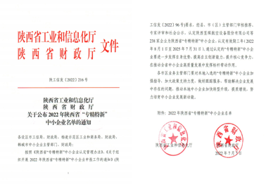 由陕西省工业和信息化厅组织,通过对企业重点经济效益指标的完成情况、专业化生产程度指标、创新能力指标、经营管理指标、企业制度建设及在节能环保绿色发展的主要做法及履行社会责任,参加公益活动等方面情况的综合衡量,于2022年7月7日陕西省工业和信息化厅、陕西省财政厅发文通过认证。