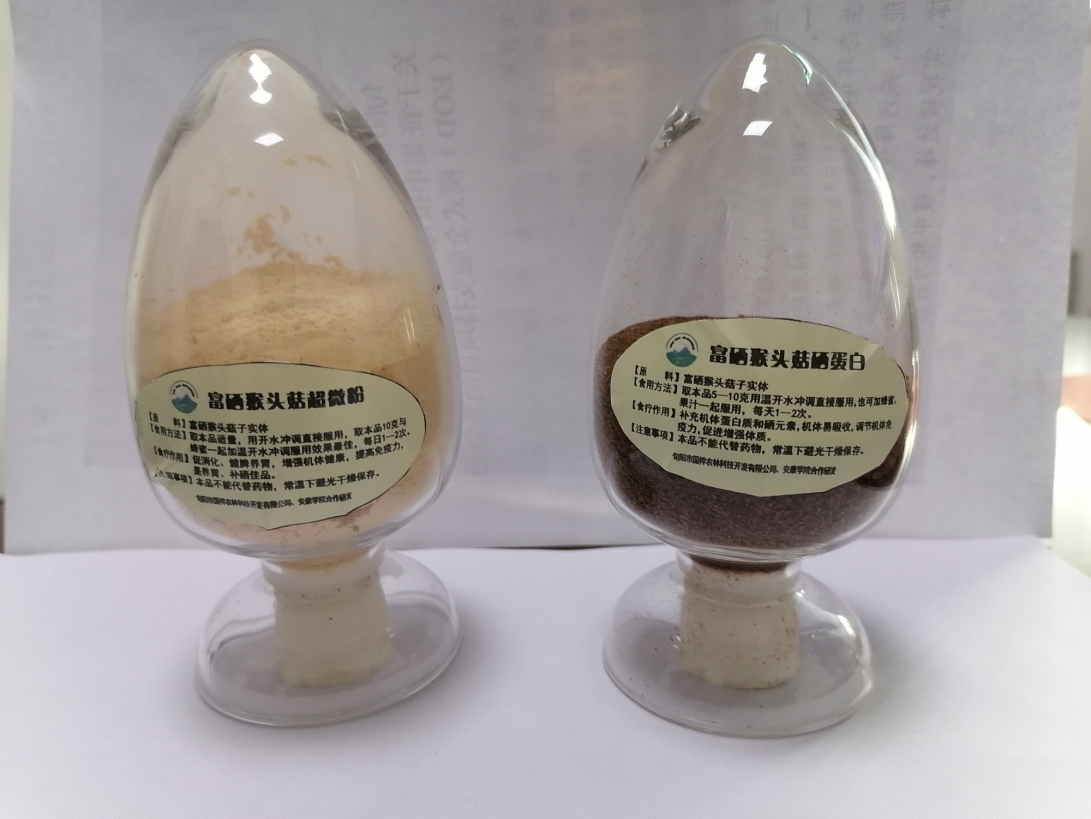 通过科技创新团队近一年的研究工作,开发出富硒猴头菇超微粉、硒蛋白产品。